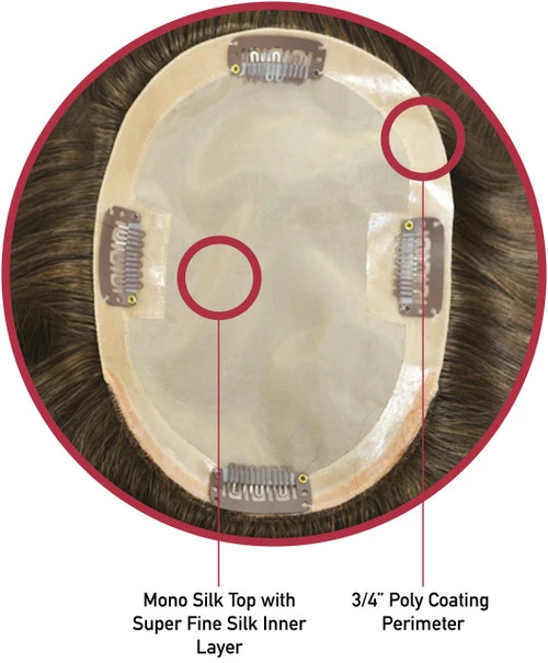 The EV5706 is a clip-on hair topper for women. It is constructed with monofilament silk making it very comfortable to wear along with an additional inner layer of super fine silk which is great for direct skin contact. It also comes with a 3/4″ polyurethane perimeter allowing for easy glue or tape installation if desired and adding to the top piece’s durability. Finally, it comes with four clips on the front, back and sides for an easy clip-on attachment while the 1/8″ double folded fine welded lace front hides the poly perimeter and provides a natural look.