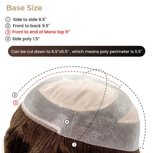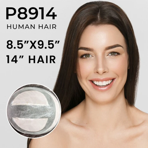 Our 14 inch P8914 Mono Top hair topper comes with the flexibility of an 8.5″x9.5″ extra large size and a double monofilament top that has cutaway poly for you to size down according to your specific needs. With the assurance of high quality Indian remy human hair, this hairpiece provides complete coverage to large areas of balding or hair loss.