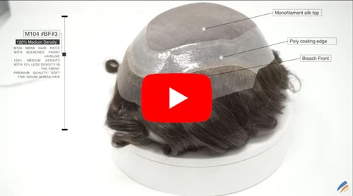 For an even more natural-looking hairpiece, you can’t go wrong with the M104 BF. This hair system is constructed with a 1/4″ French lace front filled with hair which creates a natural-looking and undetectable front hairline. The poly skin perimeter allows for easy installation, removal and maintenance, and adds to the unit’s durability. However, the main drawing point of this unit is the 1″ of true bleached knots in the front which contributes in making this natural-looking system even more realistic and undetectable.